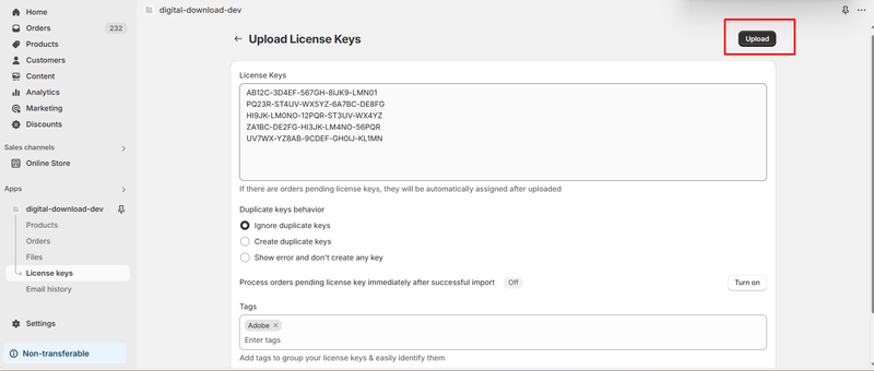 4. Click **Upload** to save the license keys